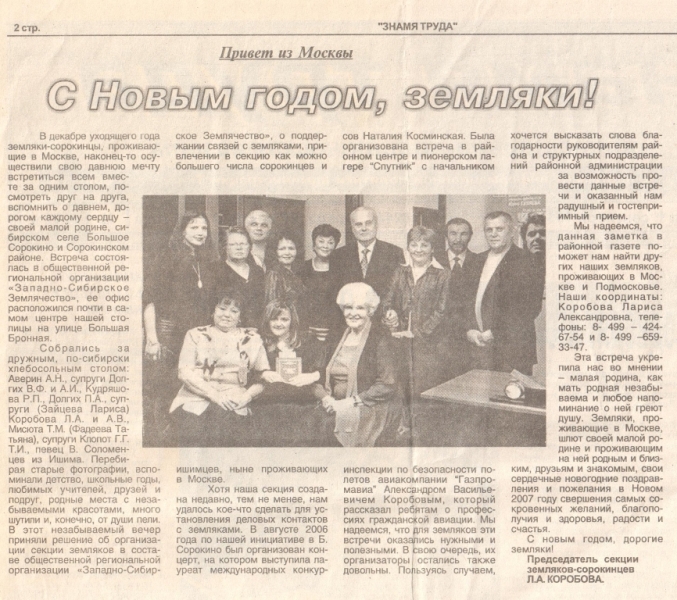 Лариса Коробова, председатель секции земляков-сорокинцев Западно-Сибирского землячества в Москве «С новым годом, земляки!»