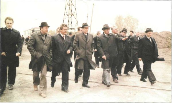 Слева направо: В. Ф. Келъ, В. А. Аронов, А. И. Рыжков, В. Г. Чирсков, Г. П. Богомяков, Б. Е. Щербина, В. К. Гусев, Ю. П. Баталин. Берег реки Туры, Тюмень, 12 мая 1988 г.