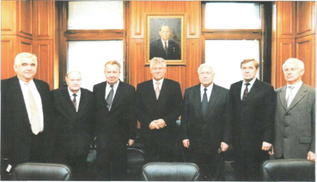 | Слева направо: В. В. Никитин, А. К. Протазанов, Л. Ю. Рокецкий, В. Г. Чирсков, В. С. Черномырдин, И. И. Мазур, В. М. Павлюченко. Москва, 1999 г. |