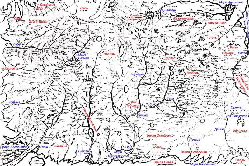 | «Чертёж всех сибирских градов и земель» из атласа Семёна Ремезова, составленного в 1701 году. Чертёж ориентирован на юг (юг-вверху). На юго-западе – озеро Балхаш, море Аральское и Хвалынское (Каспийское). На севере «земля Лопарская», «Море мангазейское» (Обская губа). На востоке – «остров Камчатка», южнее – река Амур с притоками. В юго-восточном углу карты за китайской стеной – «Китайское царство». |