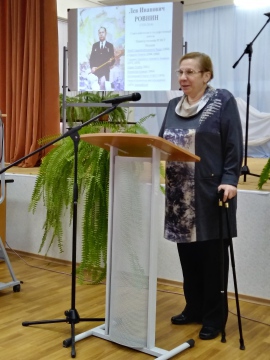 | Н.Л. Никульшина на торжественном собрании, посвященном 90-летию со дня рождения отца Л.И.Ровнина и присвоению его имени Геологоразведочному техникуму, 12 декабря 2018г. | ||