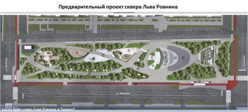 По предварительному плану, на площади более 1,3 га будут пешеходные дорожки, детские и спортивные площадки, торговый павильон. Интересна идея авторов проекта: с высоты птичьего полета аллеи сквера будут напоминать математический знак бесконечности. Изюминкой обещает стать так называемый «сухой» фонтан, струи которого будут бить прямо из-под земли. Но это летом. А зимой на главной площади сквера вместо фонтана будет работать каток с новогодней елкой в самом центре. Достойное место в одном из зеленых уголков займет бюст выдающемуся геологу – нашему земляку Льву Ивановичу Ровнину. Макет разработал тюменский скульптор Сергей Фефелов во взаимодействии с НАО «СибНАЦ» и управой Восточного административного округа.