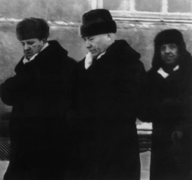 | На промысле в заполярной Мессояхе: министр газовой промышленности СССР А.К. Кортунов (в центре) и начальник главного управления по добыче газа Мингазпрома СССР В.А. Динков, октябрь 1969 года. |