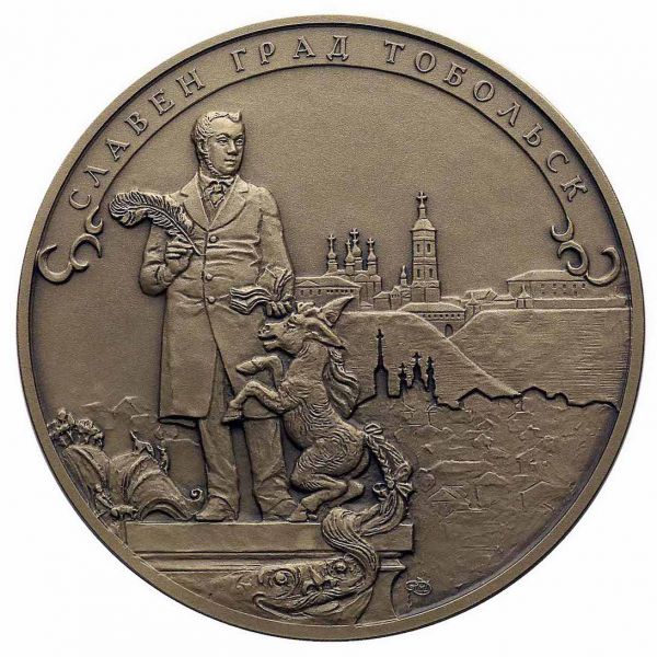 И эта устремлённость к национальным ценностям русского народа ярко выражена в художественных образах на оборотной стороне медали, где на фоне древнего Тобольского кремля изображён один из гениальных выразителей родного языка, великий сказочник Тобольска Пётр Павлович Ершов, памятник которому в Тобольске был также установлен благодаря фонду.