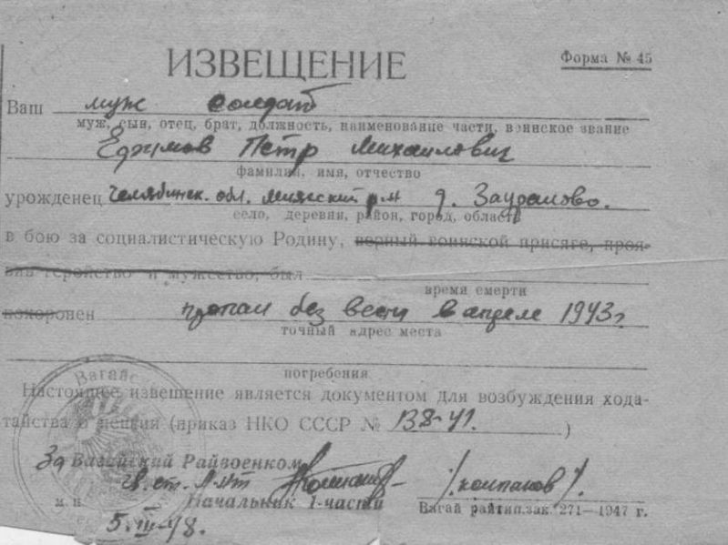 – К сожалению, очень мало, дядя Паша. Мы жили в п. Шангинск Вагайского района Тюменской области. Он был сельский фельдшер. Отец ушел на фронт в августе 1942-го. С дороги он прислал одно письмо, где писал, что их везут на запад. Потом мама получила еще одно, где он писал, что он воюет на Волховском фронте, где-то на Синявинских высотах. Больше от него не было никаких известий. Письма не сохранились. Их мать передала уже после войны в военкомат, чтобы начислили пособие на нас. Маме тяжело было растить нас троих одной. Деньги небольшие, но какая ни есть помощь.