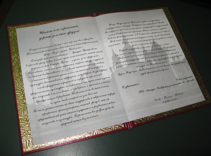 По общему признанию, издания фонда являются произведениями искусства, историческими источниками и хранителями художественного слова. Но надо помнить, что стараниями фонда восстанавливается и увековечивается память о великих людях Сибири. Не только в слове, но и в камне. Это монумент Ермаку, памятники Петру Ершову, Александру Алябьеву, Федору Достоевскому, мемориальные доски Семену Ремезову, Матвею Гагарину, Александру Алябьеву, Дмитрию Менделееву. И уникальный ландшафтный парк, который высадили известные деятели искусства, культуры, литературы. За все указанные заслуги Аркадию Елфимову торжественно вручена грамота Российского исторического общества. Учитывая географию имен, Тобольск в этот день, по сути, возрождал всю Россию. Особо прозвучали в зале произведения Александра Алябьева.