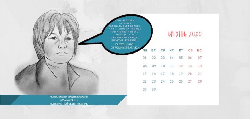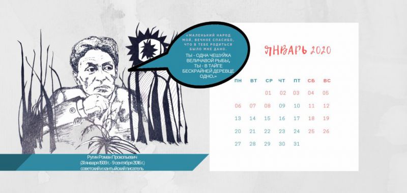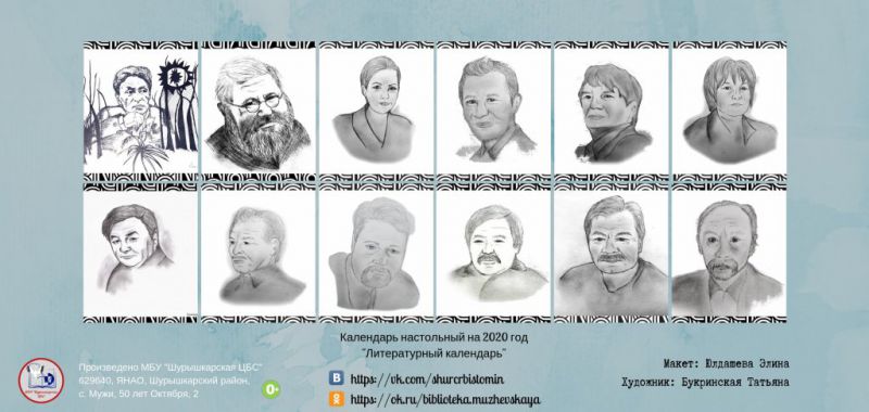 Шурышкарский район Ямала – огромный, красивый край, богатый не только своими природными ресурсами, но и историей, и прежде всего, своими замечательными людьми. На Шурышкарской земле родились и выросли талантливые поэты и писатели: Роман Ругин, Иван Истомин, Юрий Афанасьев, Микуль Шульгин, Николай Дудников, Павел Черкашин и многие другие. Каждый месяц район отмечает знаменательные даты, дни рождения своих творческих уроженцев. Для того чтобы помнить о них, был создан перекидной настольный «Литературный календарь». Под одной обложкой собраны 12 имен, вписаны их «крылатые фразы», строчки из стихотворений. Автор проекта – Элина Юлдашева.
