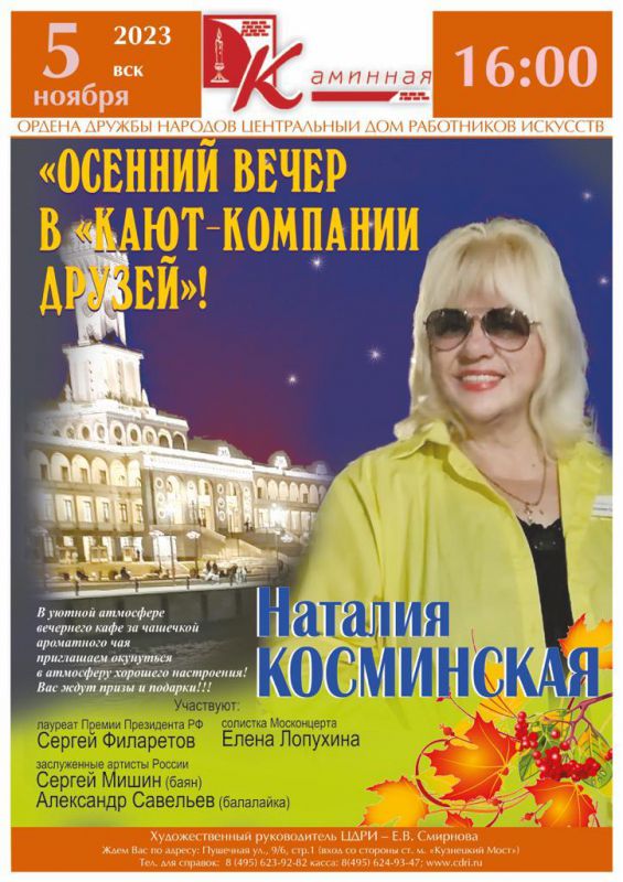 Ведёт концерт «Осенний вечер в кают-компании друзей» автор этого проекта, Почетный работник культуры г. Москвы, режиссёр, певица, продюсер Наталия Косминская.