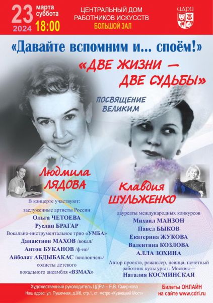 Наталия Косминская вновь приглашает земляков в Большой зал Центрального Дома работников искусств. На этот раз нас ждет концерт-посвящение великим женщинам - певице Клавдии Шульженко и композитору Людмиле Лядовой.