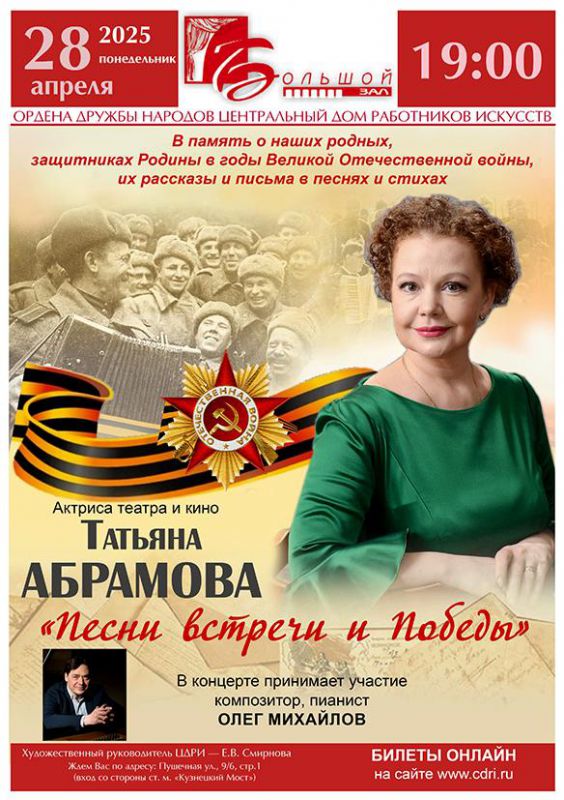 Актриса театра и кино Татьяна Абрамова приглашает земляков 28 апреля на свой концерт, посвященный Дню Победы…