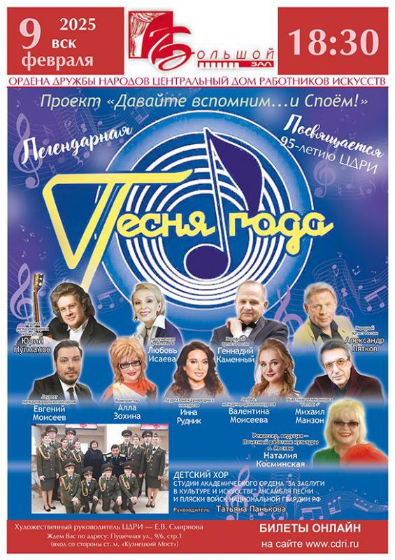 Наталия Косминская приглашает земляков 9 февраля провести незабываемый вечер в Центральном Доме работников искусств. Прозвучат любимые песни в исполнении замечательных певцов. Проект «Давайте вспомним и споем» продолжается…