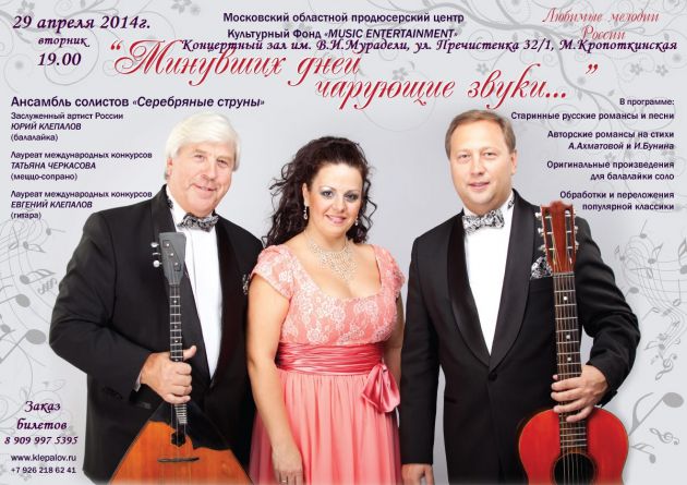 Приглашаем Вас на концерт членов нашего землячества - ансамбля солистов "Серебряные струны", который состоится 29 апреля 2014г. в 19.00 в концертном зале им. В.И.Мурадели по адресу ул. Пречистенка, д. 32/1 (метро Кропоткинская). В программе старинные русские романсы, авторские романсы на стихи Ивана Бунина и Анны Ахматовой, Нины Карташевой, обработки и переложения для балалайки в сопровождении гитары, авторские произведения для балалайки соло, популярная классика.