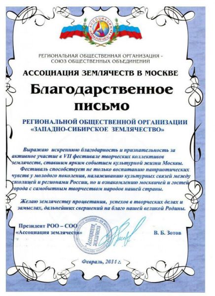 Западно - Сибирскому землячеству в Москве вручено Благодарственное письмо за участие в VII фестивале творческих коллективов. Российская муниципальная академия наградила Г.Шмаля «Медалью за вклад в подготовку празднования 70-летия Победы в Великой Отечественной войне».