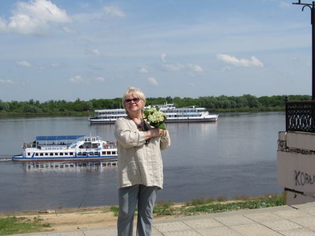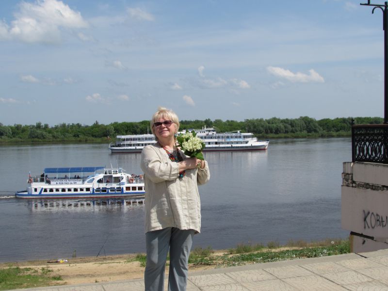 Погуляв по муромским улочкам, я попала на городской рынок, где  купила последние ландыши. С набережной был виден наш теплоход, стоящий на рейде. Местный пляж был еще пуст,  ведь это был первый, после затянувшихся дождей, неожиданно теплый, даже жаркий день, +28.  Стояла какая-то ...настоящая тишина, и на душе было ощущение пусть мимолетного, но – счастья! Счастья от сопричастности к вечному: городу, истории, реке, храмам и церквям, синему небу, любви Петра и Февронии...  А значит, к жизни. И этот момент я запечатлела на фото.