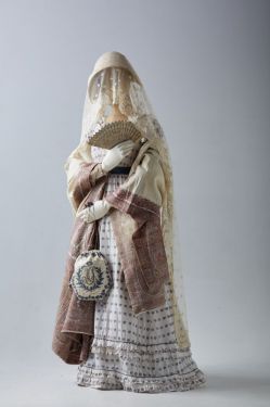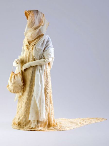 | Платье из шелка с жаккардовым рисунком. Франция, 1810 г. Шаль из коллекции А.Васильева | Бальное платье из шелка с ручной вышивкой с треном, 1910 г. Из коллекции А.Васильева |