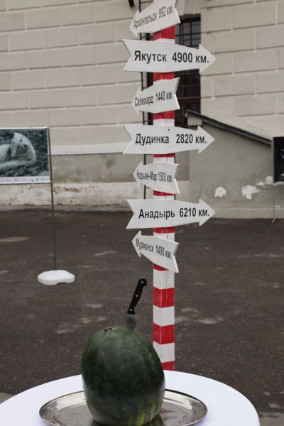 «Дни Арктики в Москве» завершились открытием уникальной мультимедийной выставки во дворе Музея Москвы (Зубовский бульвар, д.2), сформированной при участии ведущих арктических музеев, искусствоведов, фотографов, среди которых – наши земляки.Министр природных ресурсов и экологии РФ Сергей Донской и генеральный директор музея Алина Сапрыкина перешагнули символический полярный круг, осмотрели экспозицию, в которой представлены современные инсталляции подводного мира Арктических морей, фотофакты полярных экспедиций и уникальная 3D-модель научной платформы «Северный полюс», и приняли участие в традиционном разрезании арбуза.