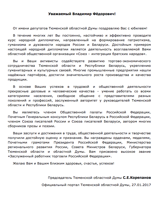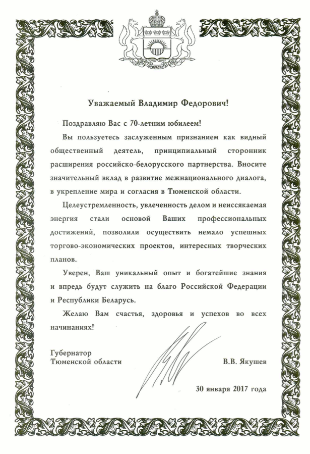 Желаем Вам дальнейшей реализации курса народной дипломатии, формирующей патриотизм, гуманизм и духовность. Плодотворной работы, направленной на сохранение и популяризацию истории, традиций, культуры и языка славянских этносов. Успешного укрепления дружбы и сотрудничества между народами, населяющими Беларусь и Россию, Тюменскую область, между земляками, проживающими в Западной Сибири и Москве! Здоровья, исполнения всех планов и процветания Вам, Вашим родным и близким!